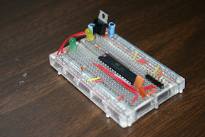 I got a regular Duemilanove from Adafruit a couple of weeks ago. These things are so nice that they include all of the basic necessary components like the USB to RS232, the automatic voltage input switching, pin headers etc. I've been fiddling with that and learning some of how it works. I wanted to get a second for the purposes of having the two Arduino's talk to each other. Naturally I decided to do this the harder way and assemble one on a breadboard.